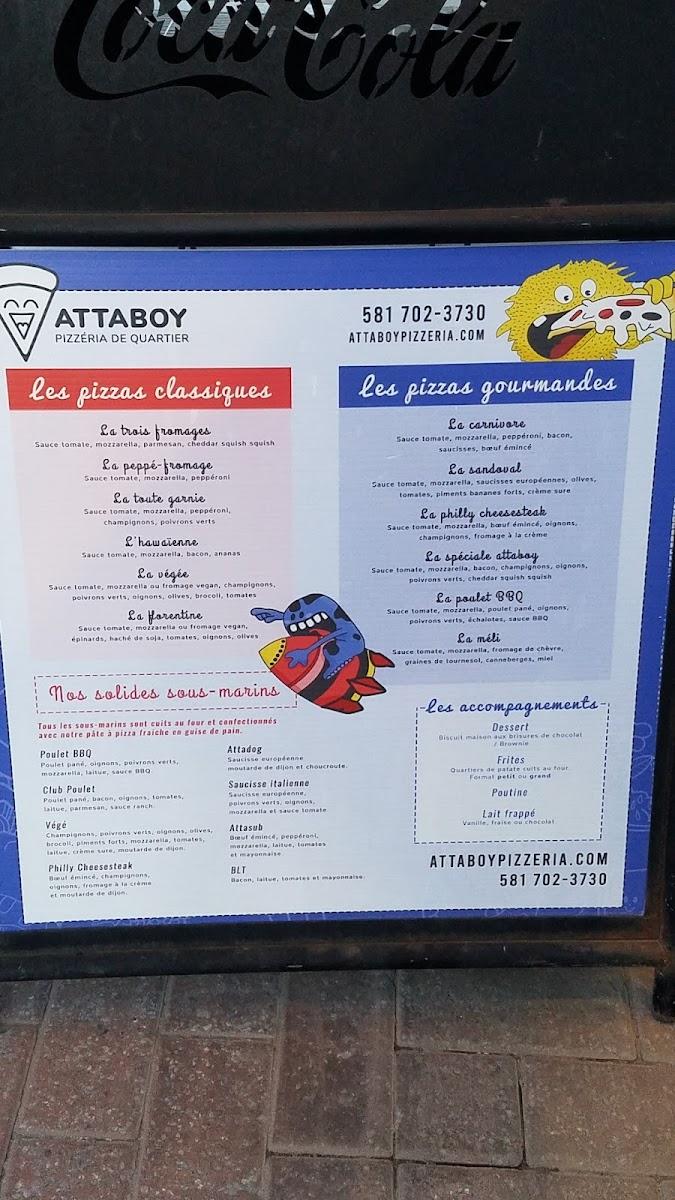 Welcome to Attaboy, pizzeria de quartier, a cozy culinary gem located at 597 Rue Saint-Jean, Québec. This charming pizzeria impresses not only with its inviting atmosphere but also with an exceptional menu that boasts a variety of mouthwatering pizzas.